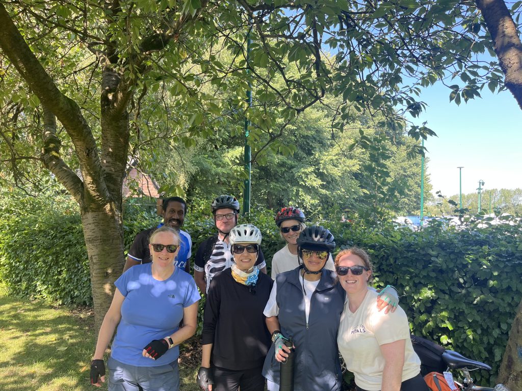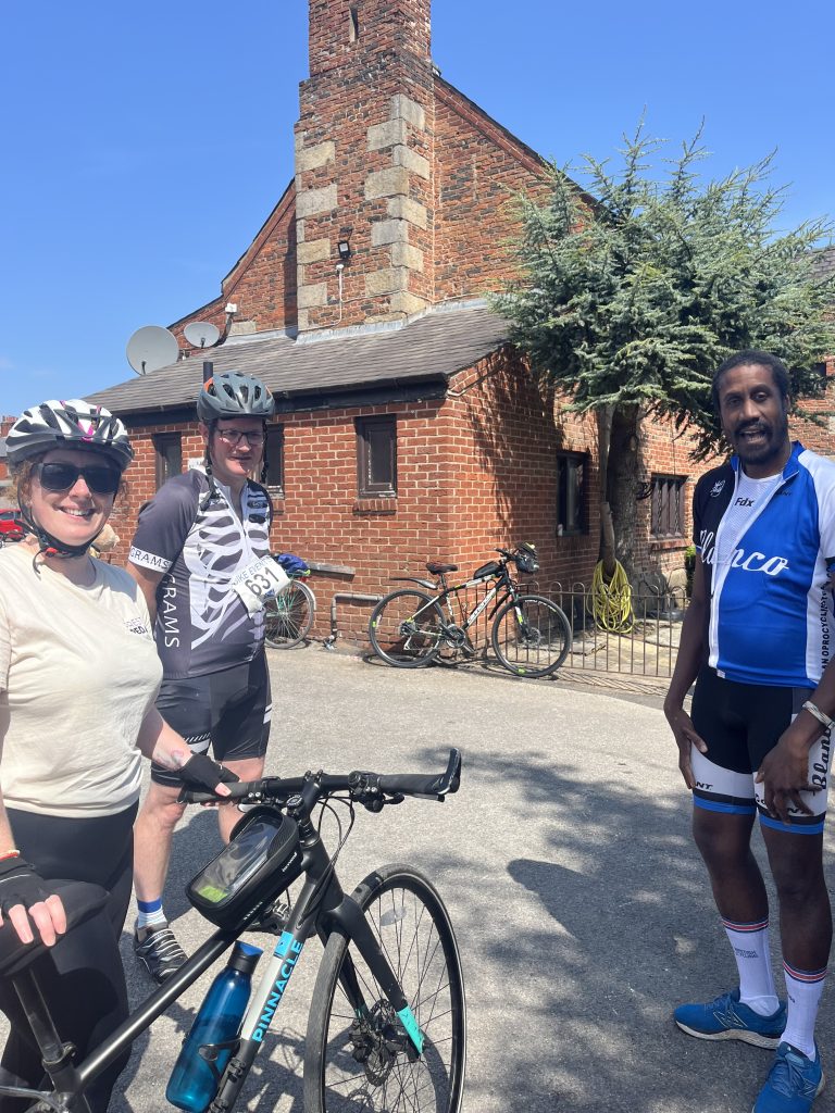 We were in great form and managed to stay together as a group for most of the journey, stopping for official breaks, stretching, water refills and much needed snacks – thanks to Sam for the chocolate limes and Shanaz for the cashew nuts which kept us going. The route was well planned, and we passed through lovely countryside with good signposts to prevent us getting lost – and car drivers were mainly considerate and patient to the 2000 cyclists undertaking the challenge.